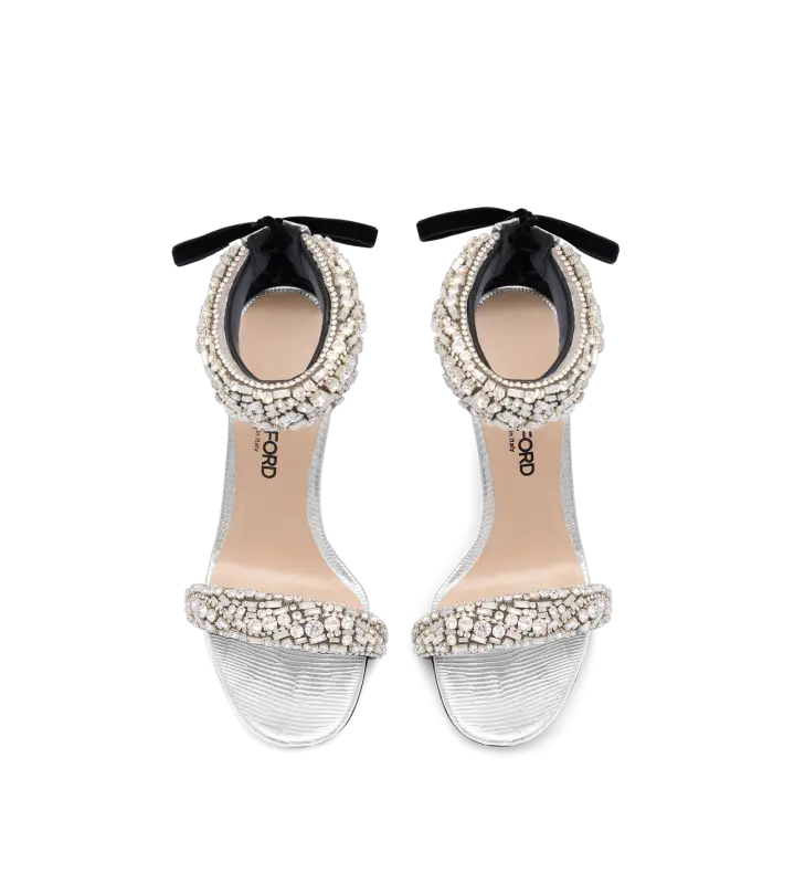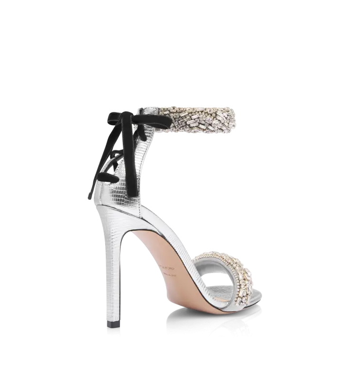 CRYSTAL-EMBELLISHED LAMINATED PRINTED LIZARD EDIE SANDAL SILVER + CRYSTAL